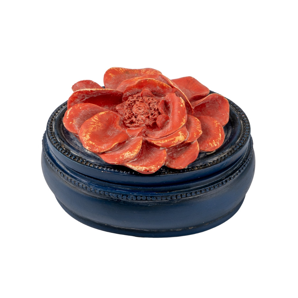Скринька «Чайна троянда» неймовірної краси предмет інтер'єру. Скринька виконана в класичному стилі. Лаконічні лінії глибокого синього кольору доповнює прекрасний елемент - об'ємну червону квітку чайної троянди. Такий предмет декору стане відмінним доповненням вашого інтер'єру і найкращим чином відобразить естетичний смак його власника.